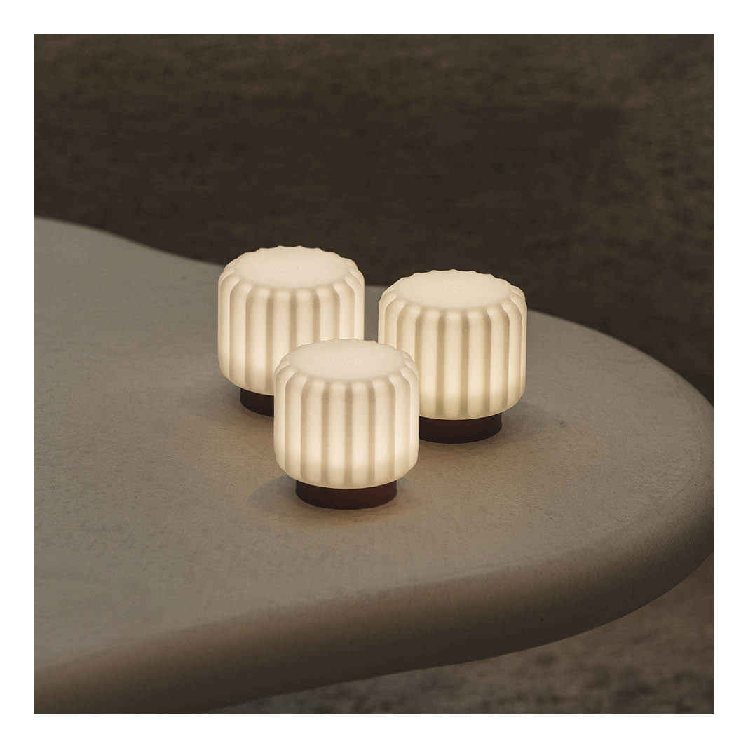 De Dentelles lampen zijn draadloos en dimbaar, geschikt voor binnen en buiten en verkrijgbaar in diverse vormen en kleuren. De module van de lamp is gemaakt van 100% gerecycleerd polyethyleen.