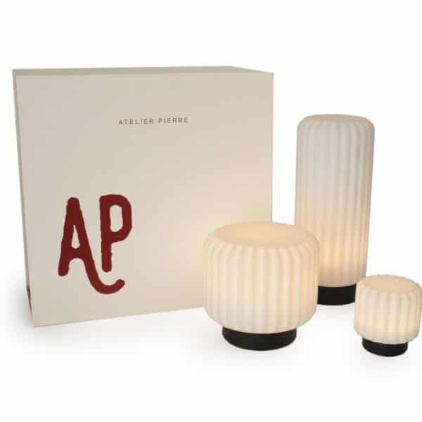 Geef gezelligheid cadeau met de luxe Dentelles giftbox van Atelier Pierre. Deze zorgvuldig samengestelde set bevat drie stijlvolle draadloze lampen – mini, wide en tall – in een uniforme afwerking. Alles mooi verpakt in een elegante geschenkdoos, klaar om iemand blij te maken of om je eigen interieur een upgrade te geven.