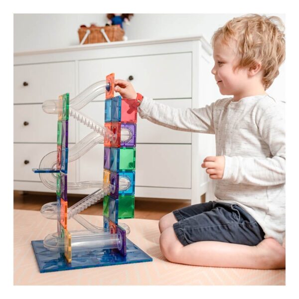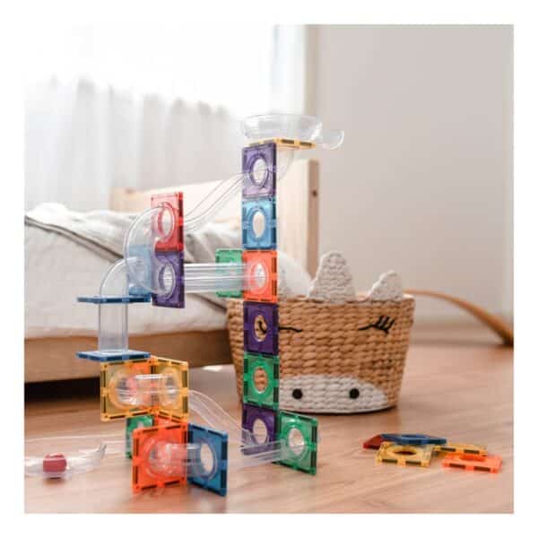 Dankzij de sterke magneten bouwen kinderen eenvoudig stevige constructies. Met de meegeleverde balletjes en verschillende soorten buizen creëren ze een spannende achtbaan of hindernissenbaan waarin de knikkers razendsnel naar beneden rollen. Uren speelplezier én leren gegarandeerd!