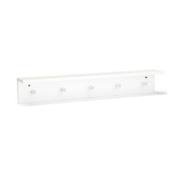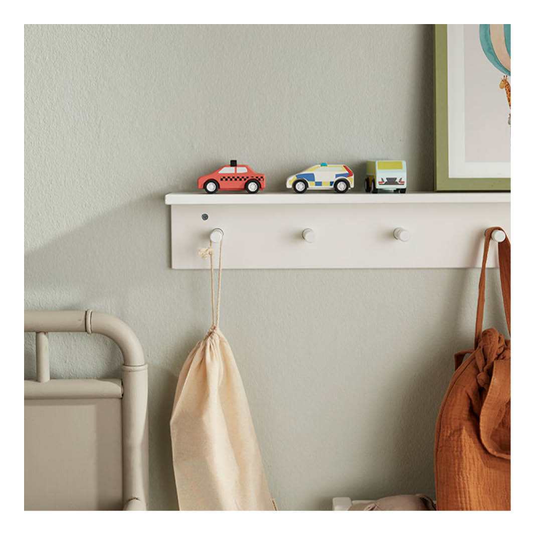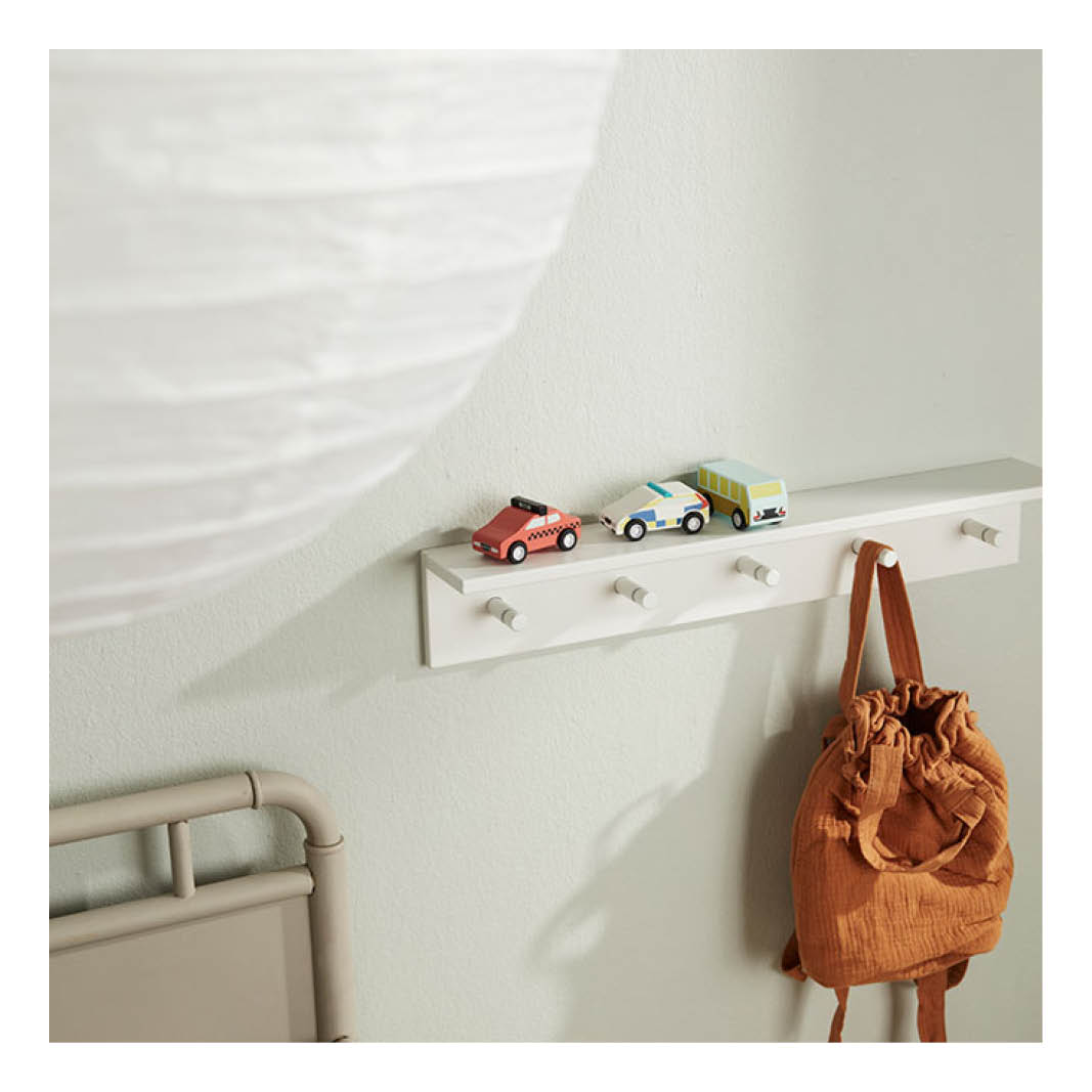 Deze strakke kapstok van Kids Concept is een ideale toevoeging aan de baby-of kinderkamer. De kapstok heeft 5 haken, ideaal om kleding, rugzakje of andere hebbedingetjes van je kindje aan te hangen. Leuk detail, boven de kapstok heb je een wandplank, waarop je nog heel wat leuke spulletjes op kwijt kan.