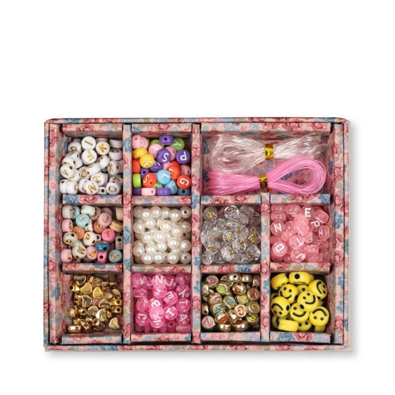 Met 60 letterkralen, 25 smiley-kralen en twee soorten nylondraad (in roze en transparant) zijn de mogelijkheden eindeloos. Spelenderwijs oefenen kinderen hun fijne motoriek, leren ze combineren én maken ze iets dat ze met trots kunnen dragen of cadeau kunnen doen.