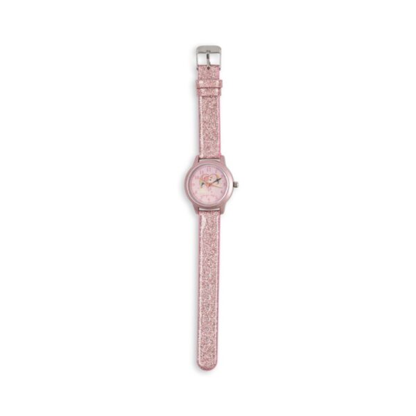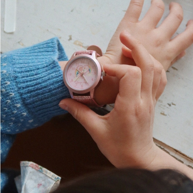 Het horloge heeft drie wijzers en een zachte stoffen polsband die comfortabel zit rond kleine polsen. De verstelbare stalen gesp zorgt ervoor dat het horloge met je kindje meegroeit. Ideaal voor dagelijks gebruik thuis, op school of onderweg.