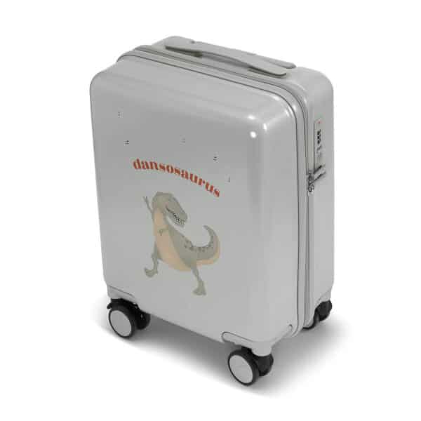 Met deze handige reiskoffer van Konges Slojd reist jouw kindje mee in stijl. De kindertrolley heeft een blauw/grijze kleur met een dansende dinosaurus ‘de dansosaurus’ erop. Het valiesje is ideaal om kleding, knuffels of speelgoed in op te bergen om mee te nemen als handbagage op het vliegtuig of als koffertje voor een uitstapje of sleepover.