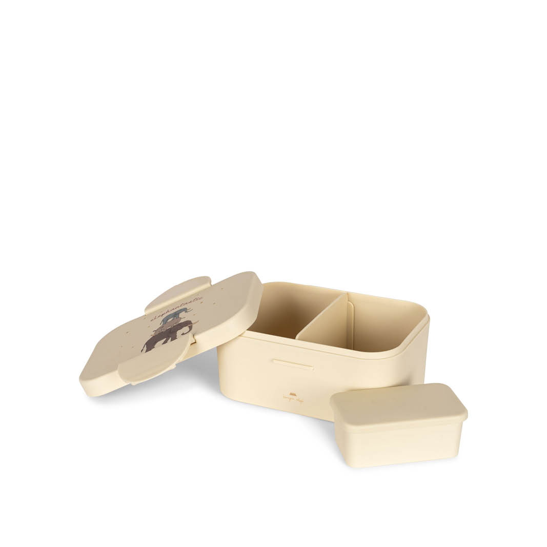 Dankzij de clips aan beide kanten van het deksel kan je kindje de box makkelijk zelf openen en sluiten. Binnenin vind je een praktische verdeler én een kleiner doosje met siliconen deksel, ideaal om fruit of snacks apart te bewaren.