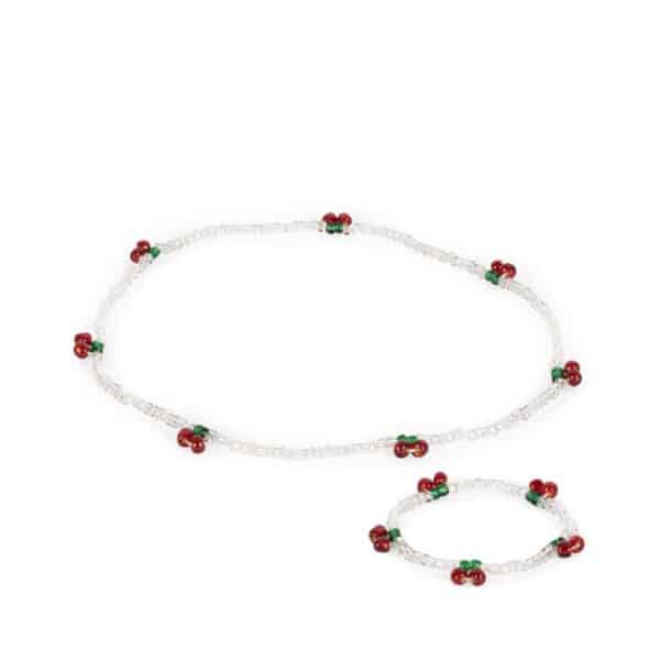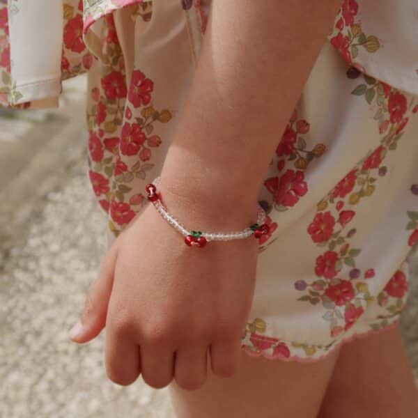 Maak elke outfit compleet met deze schattige juwelenset van Konges Sløjd. Het setje bestaat uit een matching kralenketting en kralenarmband, allebei afgewerkt met de iconische kersjes. Ideaal voor kleine modebewuste kinderen die graag hun eigen stijl laten zien!