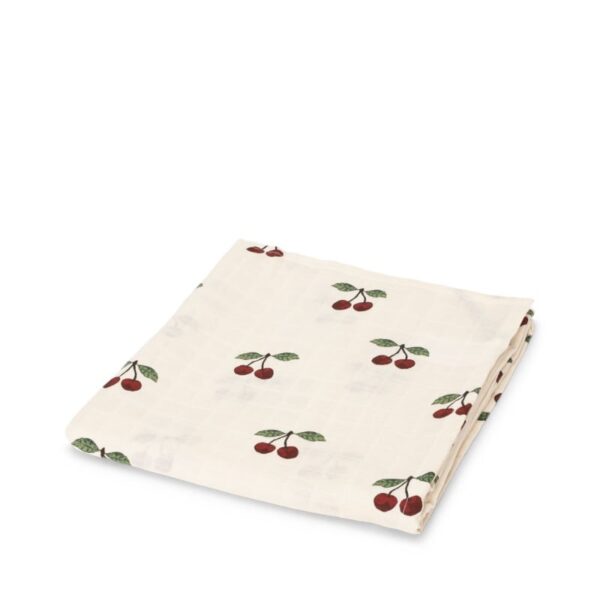 Tetradoeken zijn onmisbaar voor elke ouder en deze van Konges Sløjd is er eentje die je met plezier overal mee naartoe neemt. Met zijn grote formaat (115 × 115 cm) en de speelse kersenprint is hij niet alleen handig, maar ook een echte eyecatcher.