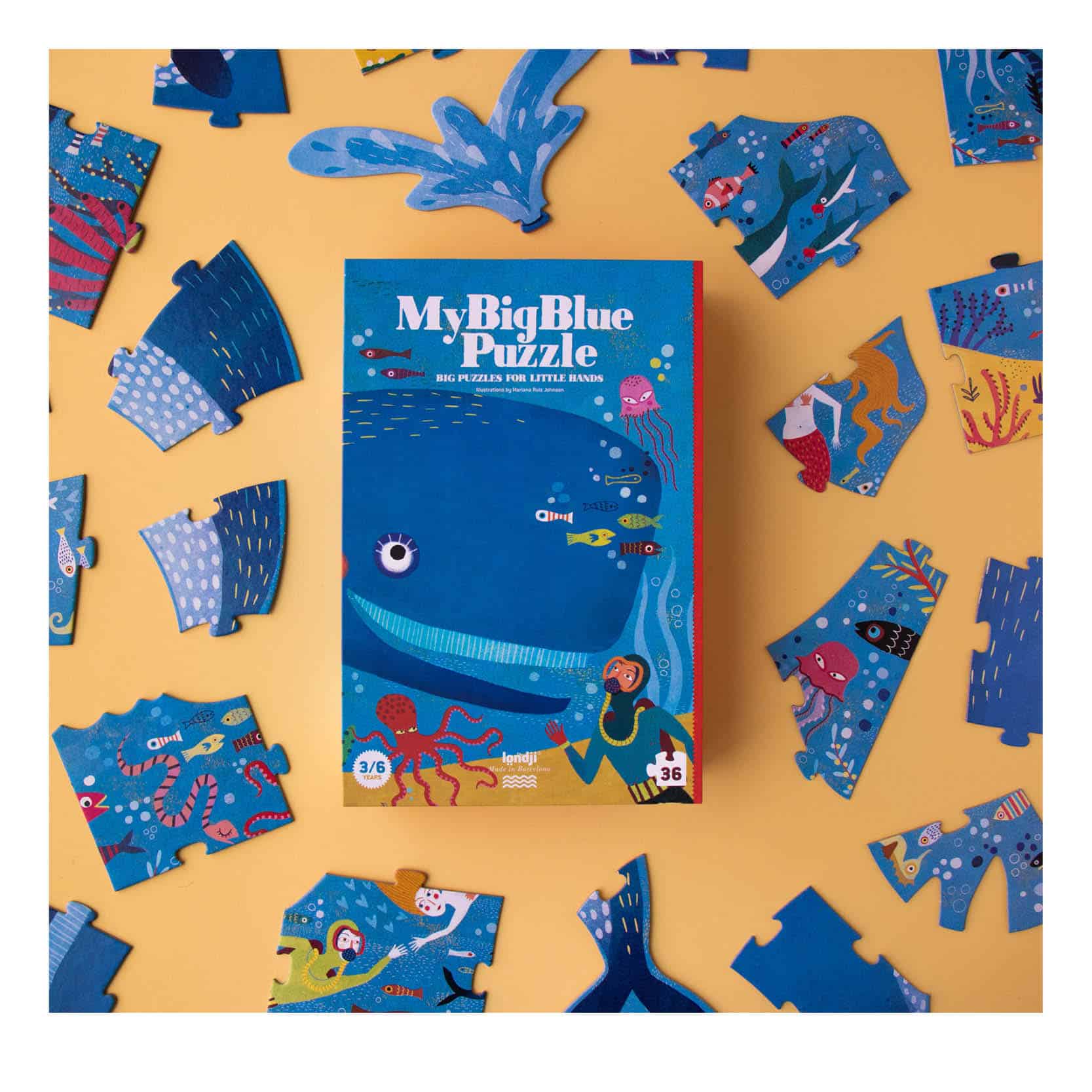 Zwem samen met de grote blauwe walvis, glijd langs speelse haaien en bewonder de mysterieuze koningin van de zee. Met deze betoverende puzzel van Londji ontdek je de magie van de oceaan, stuk voor stuk.
