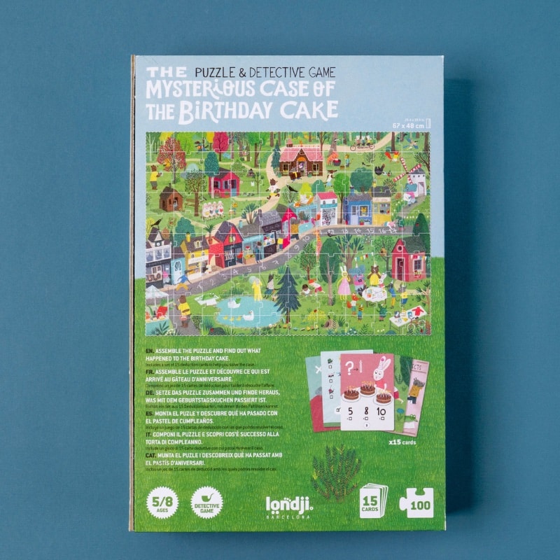 In het midden van het bos ligt een klein, betoverend dorpje… Maar oh nee! De taart van het verjaardagsfeest is verdwenen! Wie o wie heeft hem meegenomen? Met deze 100-delige puzzel én speurspel van Londji stap je in de rol van jonge detective.