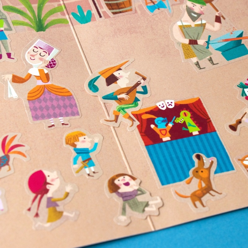 Deze set bevat 100 herbruikbare stickers en een grote decoratieve achtergrond om je eigen scene op te bouwen ideaal voor onderweg of een creatief moment thuis.