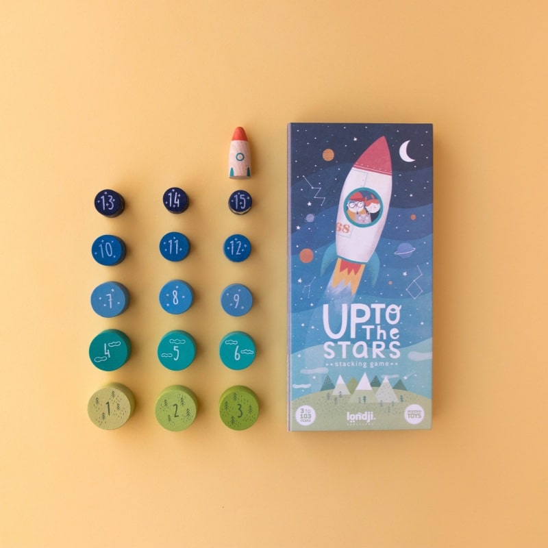 Help de raket van Londji opstijgen door hem steen voor steen op te bouwen! Kun jij de 15 houten stukken van groot naar klein stapelen zonder dat hij omvalt? Als het lukt én hij blijft rechtop staan… 3, 2, 1… Lift-off naar de sterren!