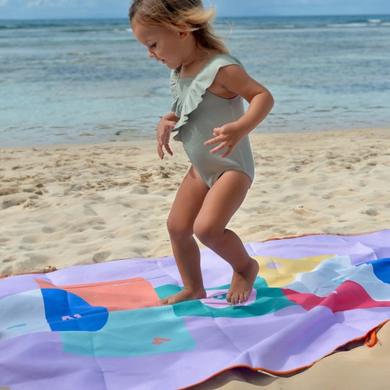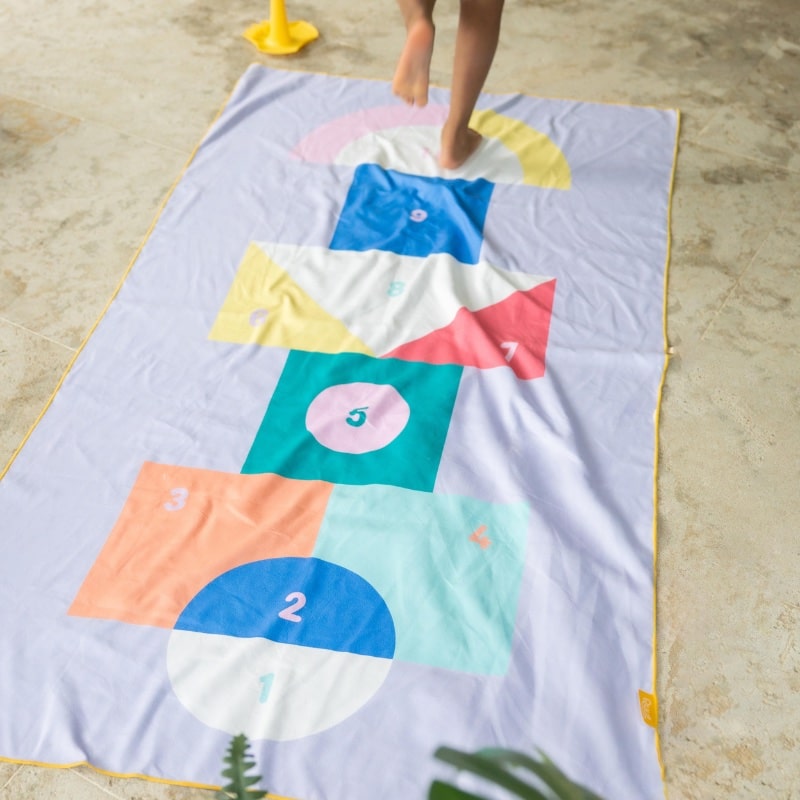 Op de voorkant staat een hink-stap-sprong spel (hopscotch) dat kinderen uitnodigt om te springen, bewegen en plezier te maken. De achterkant heeft een stijlvol grafisch patroon, waardoor de handdoek ook perfect gebruikt kan worden als gewone strand- of zwembadhanddoek.