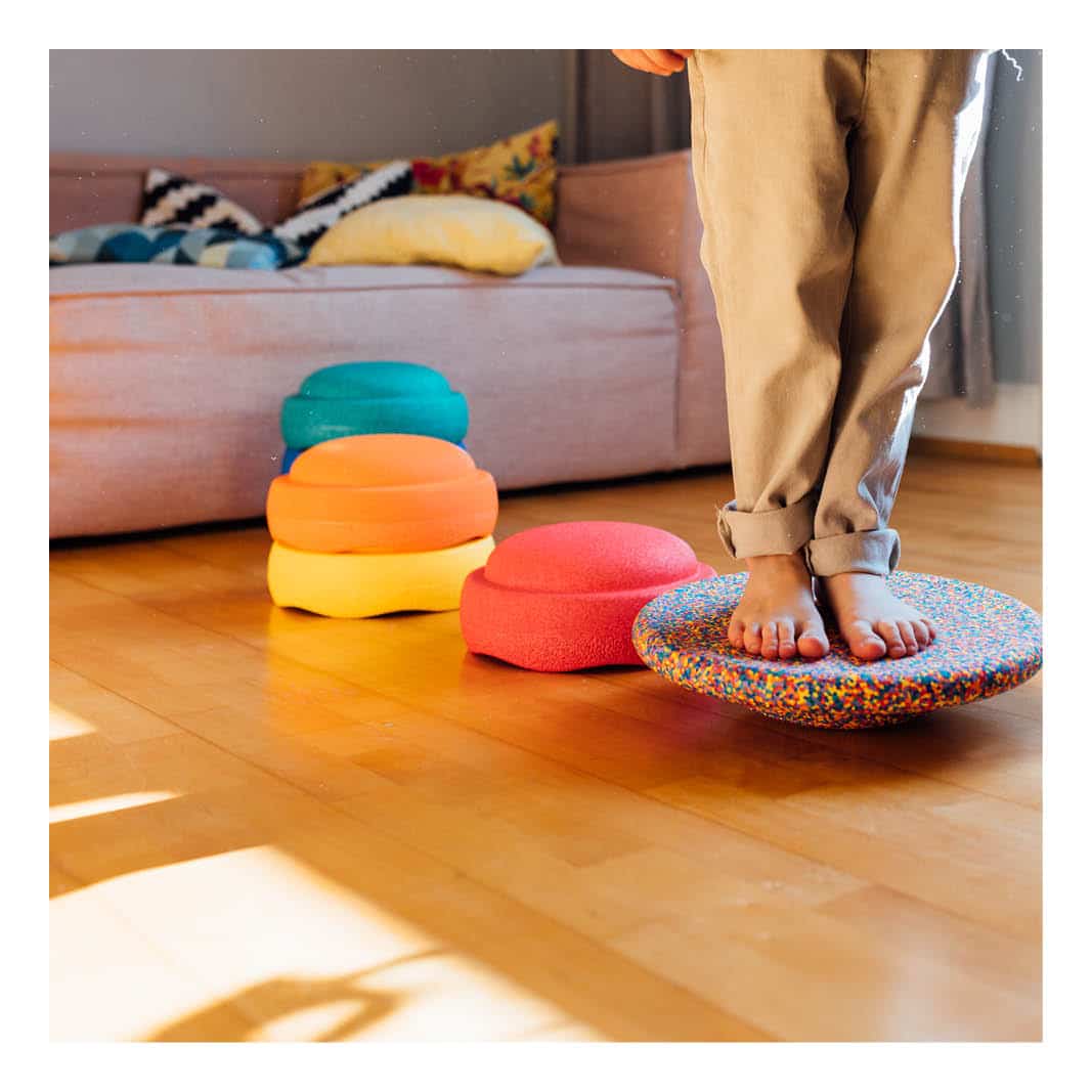 Kinderen kunnen de stenen gebruiken om stoeltjes te bouwen, evenwichtsspelletjes te doen of klassiekers zoals ‘de grond is lava’ te spelen. Het balance board maakt het spel nóg uitdagender en stimuleert kinderen om te bewegen en te ontdekken.