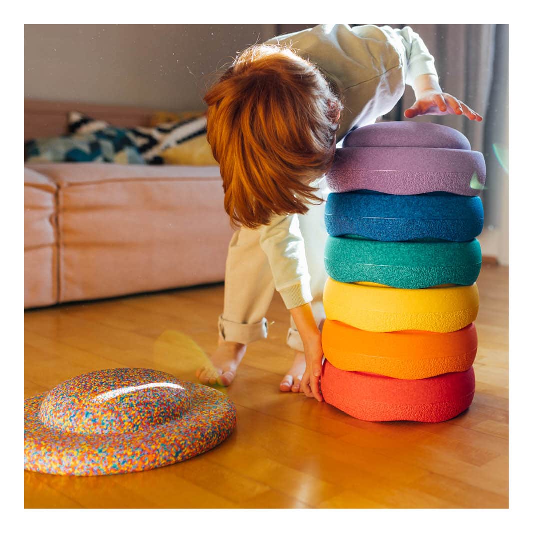 De Stapelstein Rainbow Set bestaat uit 6 stapelstenen in de vrolijke kleuren van de regenboog én een confetti balance board om de set compleet te maken. Dé perfecte combinatie voor eindeloos stapelen, balanceren en fantasierijk bewegen.
