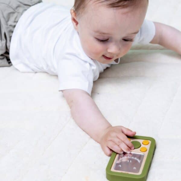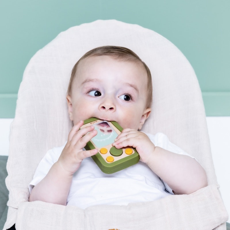 De telefoon heeft leuke siliconen knopjes om in te drukken en een klein spiegeltje dat de nieuwsgierigheid prikkelt. Zo wordt de oog-handcoördinatie op een natuurlijke manier gestimuleerd. De zachte siliconen rand voelt comfortabel aan en is bovendien ideaal bij doorkomende tandjes, het verzacht het tandvlees wanneer je baby erop sabbelt.
