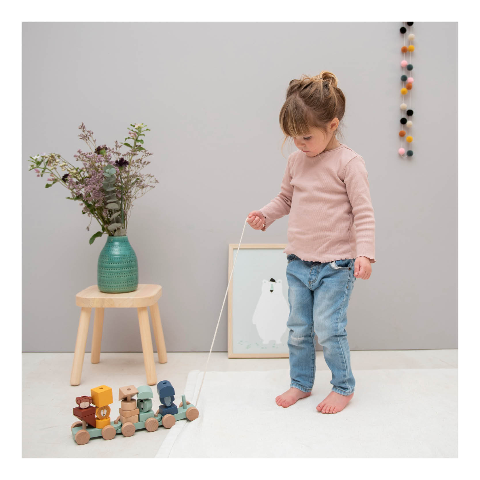 Alle dierenvrienden springen aan boord van deze kleurige houten trein van Trixie! Met de losse blokken in vrolijke kleuren kan je kindje zijn eigen wagons bouwen en telkens opnieuw een unieke trein samenstellen. Klaar? Dan neem je de trein mee op avontuur met het handige touwtje aan de voorkant.
