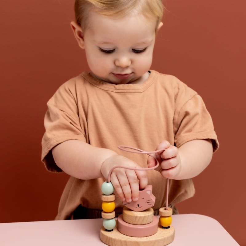Met het houten kralenframe van Trixie beleefd jouw kindje uren speelplezier. Laat de kralen met verschillende vormen en kleuren glijden door het doolhof om zo op de juiste plaats te komen. In het midden is er een mini stapeltorentje van 3 blokjes, met Mrs Cat als hoofdfiguur. Dit kralenframe helpt bij de ontwikkeling van de fijne motoriek