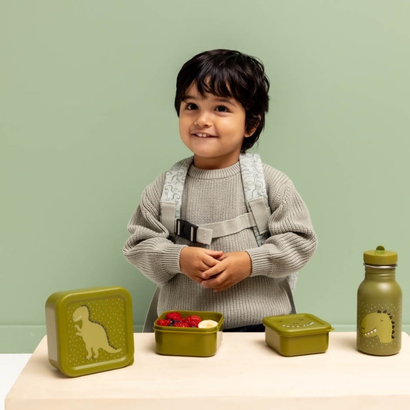 – Drinkflessen, lunchboxen en snackdoosjes: handig, lekvrij en in bijpassende kleuren en prints.